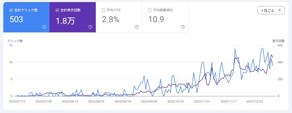 ※Search Consoleの数値は期間・検索状況により日々変動します。本記事では、あくまで傾向を振り返る目的で掲載しています。