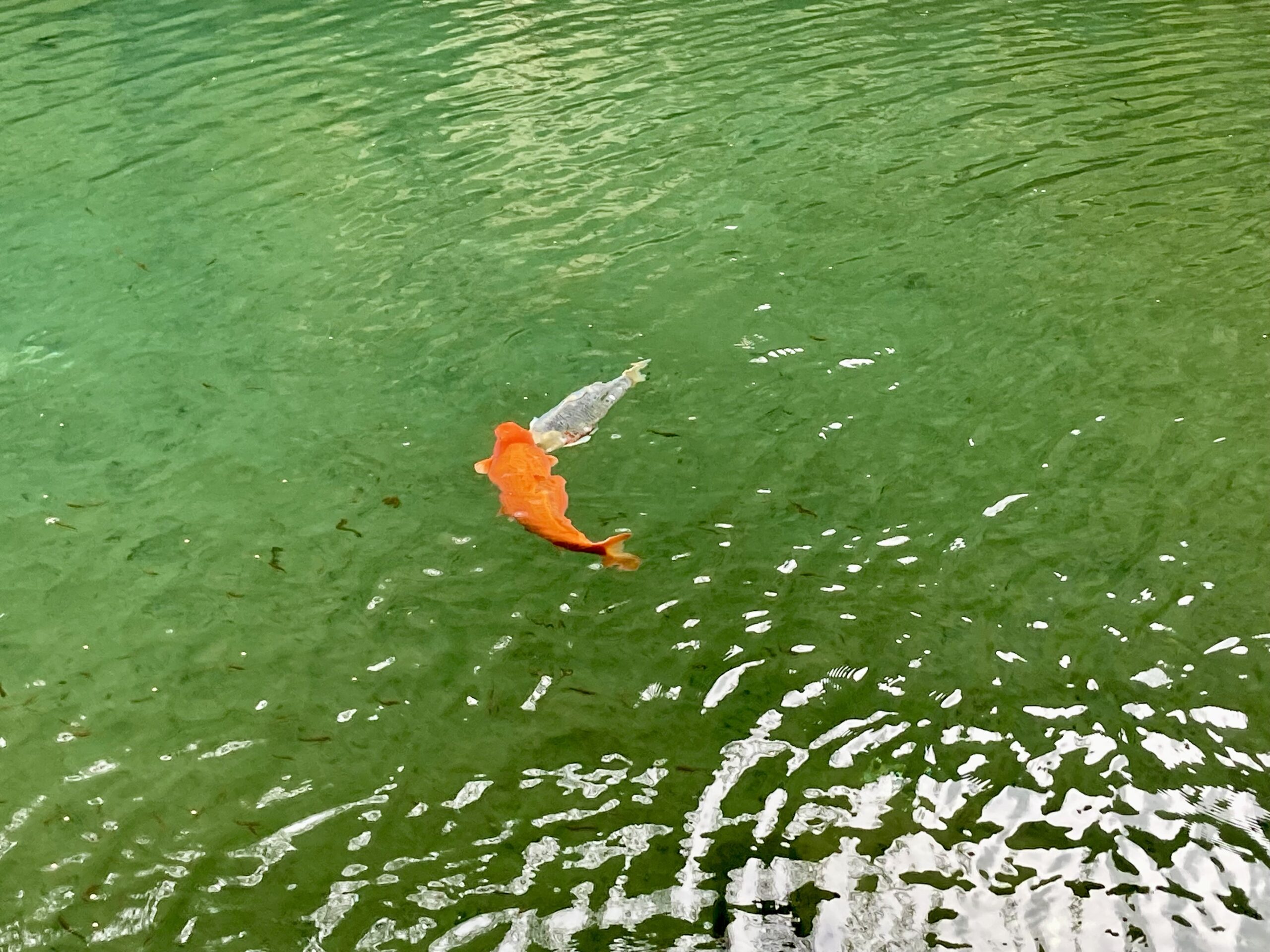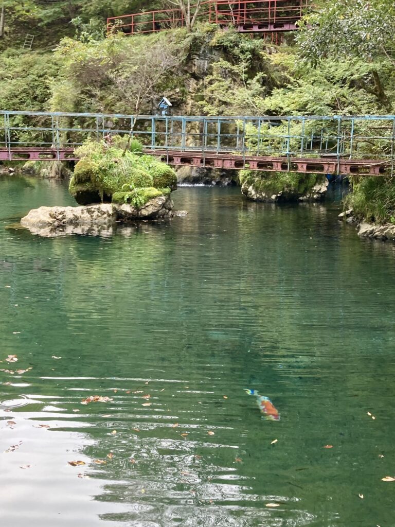 湖の周囲には遊歩道や小さな橋も整備されています。静かな湖の周りを歩きながらゆったりと泳ぐカラフルな鯉たちの姿と湖面のコントラスト。幻想的な景色を楽しめます。よく観察すると、たくさんのアマゴやウグイも観察できます。あいにくこの日は曇りだったので、湖の美しさを表現しきれていませんが、晴天時に津野町へお越しの際にはぜひお立ち寄りください。