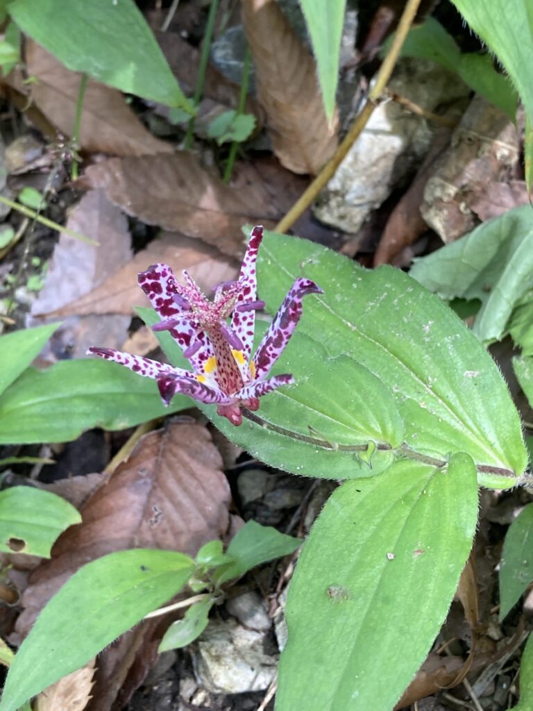 紫の斑点が目を引きます。私はこの花を見ると、いつもイカみたいな不思議な花だな、と思っています(笑)