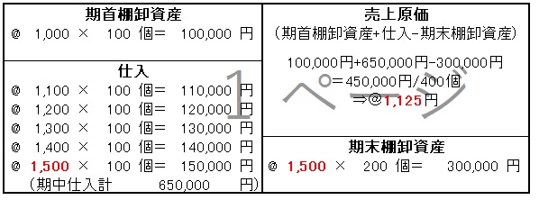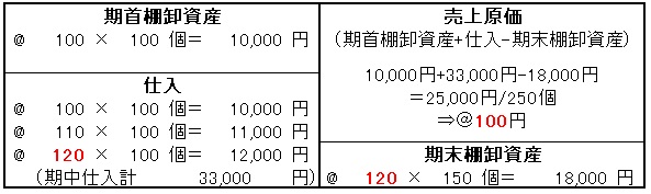 期末在庫が150個だった場合、**最後の仕入単価(¥120)**を使って評価します。