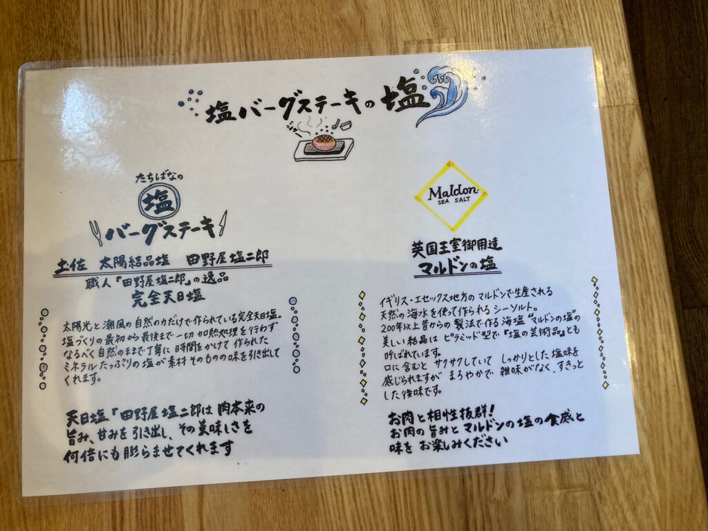 塩バーグステーキは、田野屋塩二郎 と マルドンの塩 の2種類で味変が可能。